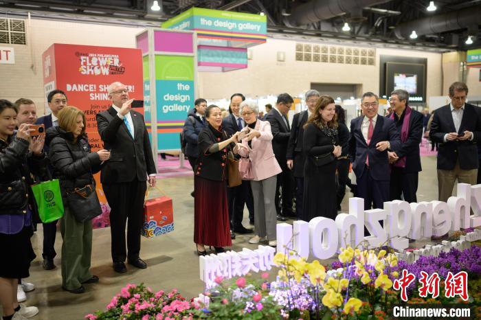 當(dāng)?shù)貢r(shí)間3月2日,一年一度的費(fèi)城花展在美國(guó)賓夕法尼亞州費(fèi)城開幕,以“功夫鄭州——花俏嵩山”為主題的鄭州展園當(dāng)天在花展上亮相。圖為中國(guó)駐紐約總領(lǐng)事黃屏(右三)帶領(lǐng)嘉賓參觀鄭州展園。 Franck Zhou 攝