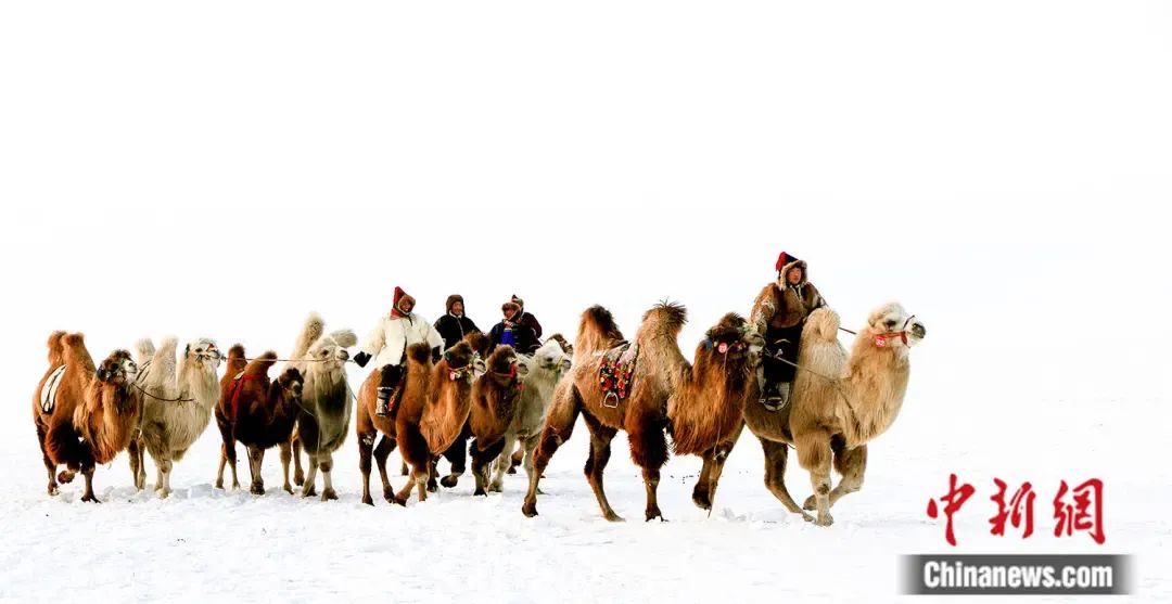 銀裝素裹中,牧民騎著駱駝趕往賽駝現(xiàn)場(chǎng)。 高洪斌 攝