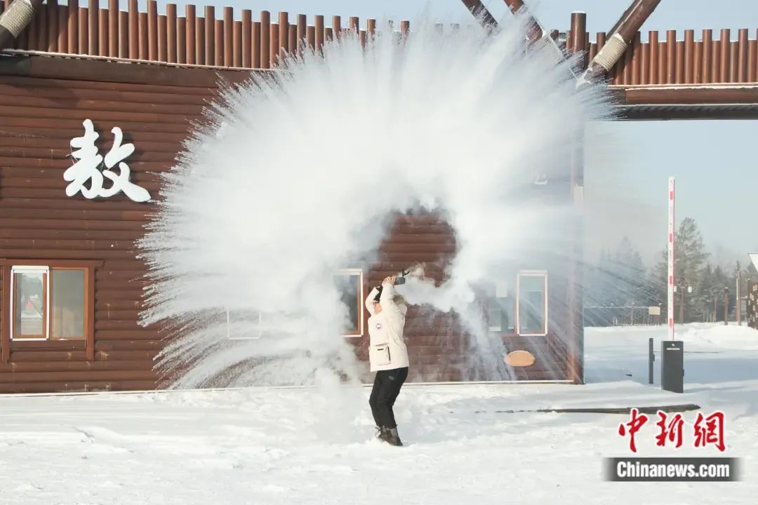 游客在極寒天氣中體驗(yàn)潑水成冰的快樂(lè)。 根河市委宣傳部供圖