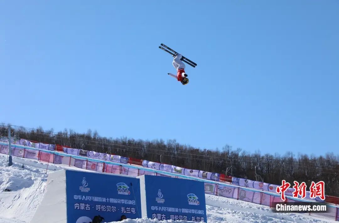 “十四冬 ”自由式滑雪空中技巧公開組女子個(gè)人比賽中,徐夢(mèng)桃在空中翻飛。 韓冷 攝