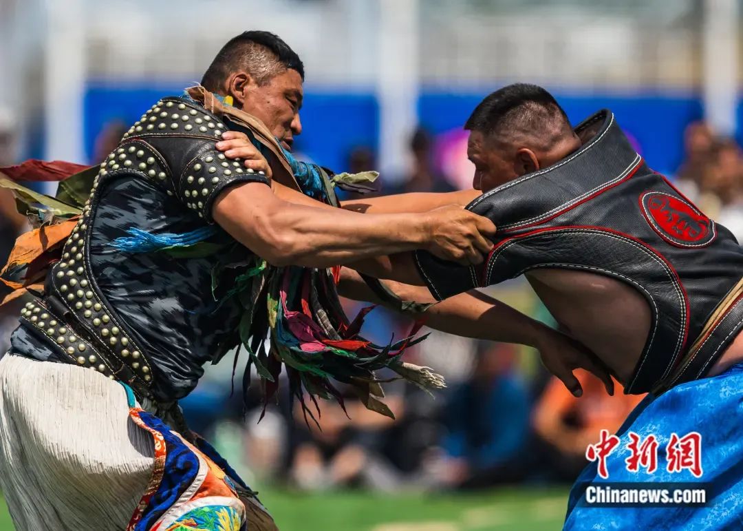 鄂溫克草原上的蒙古族那達(dá)慕上演傳統(tǒng)“男兒三藝”——搏克比賽。 呼木吉樂(lè) 攝