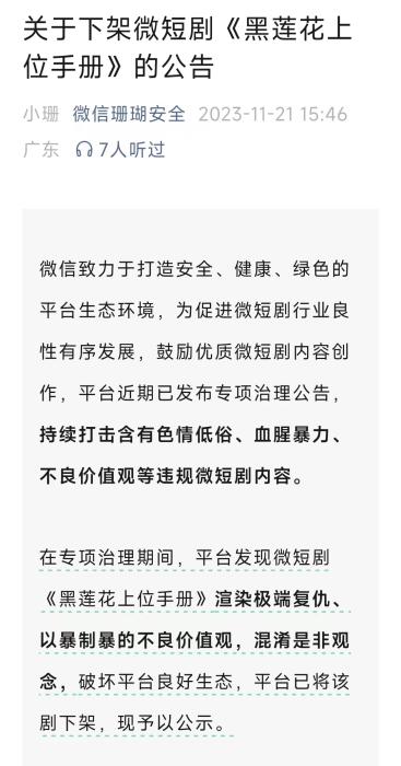 然而,良莠不齊一直是微短劇的行業(yè)痛點(diǎn)。2023年11月,《黑蓮花上位手冊(cè)》上線一周之內(nèi)被平臺(tái)下架。