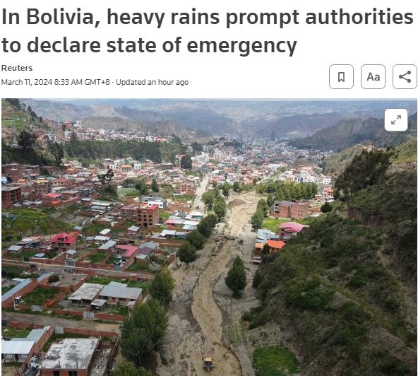 據(jù)此前報(bào)道,自3月開始,拉巴斯遭遇持續(xù)降雨,山體滑坡、洪水、泥石流等自然災(zāi)害多發(fā)。官方數(shù)據(jù)顯示,自1月雨季開始以來,玻利維亞全國各地已有近50人死于洪水。