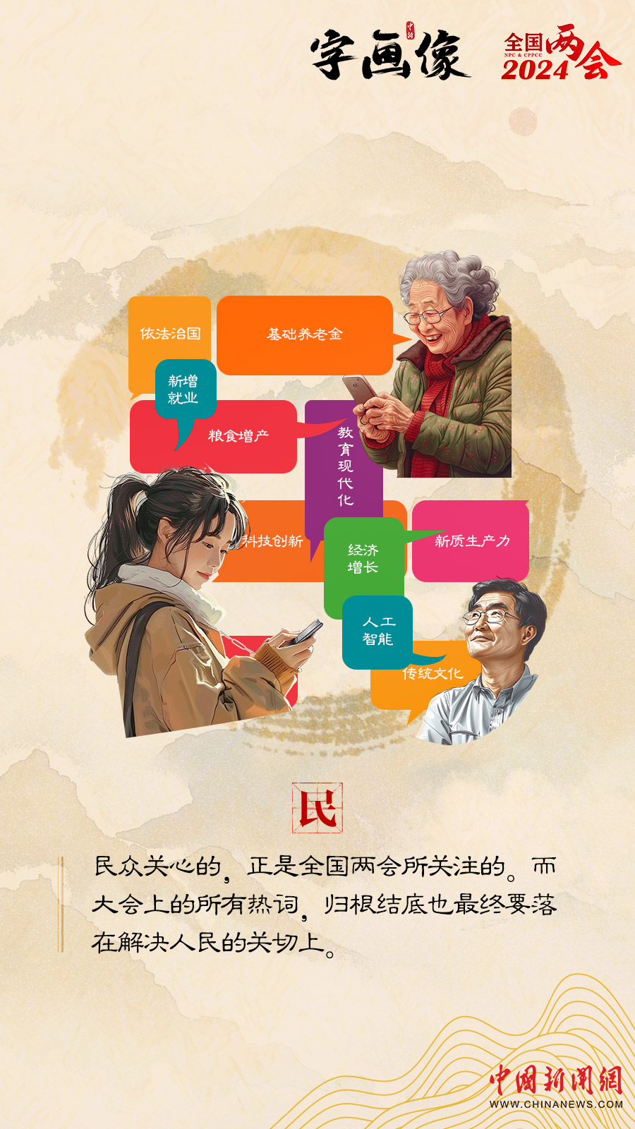 “兩會熱詞”折射著民聲民意,反映著人民群眾對美好生活的向往和憧憬,承載著老百姓對各項工作的期待與希冀,我們嘗試以字入畫,通過九個漢字的漫畫像,梳理全國兩會報道中的熱詞,以期一窺民生脈搏,了解百姓關切。