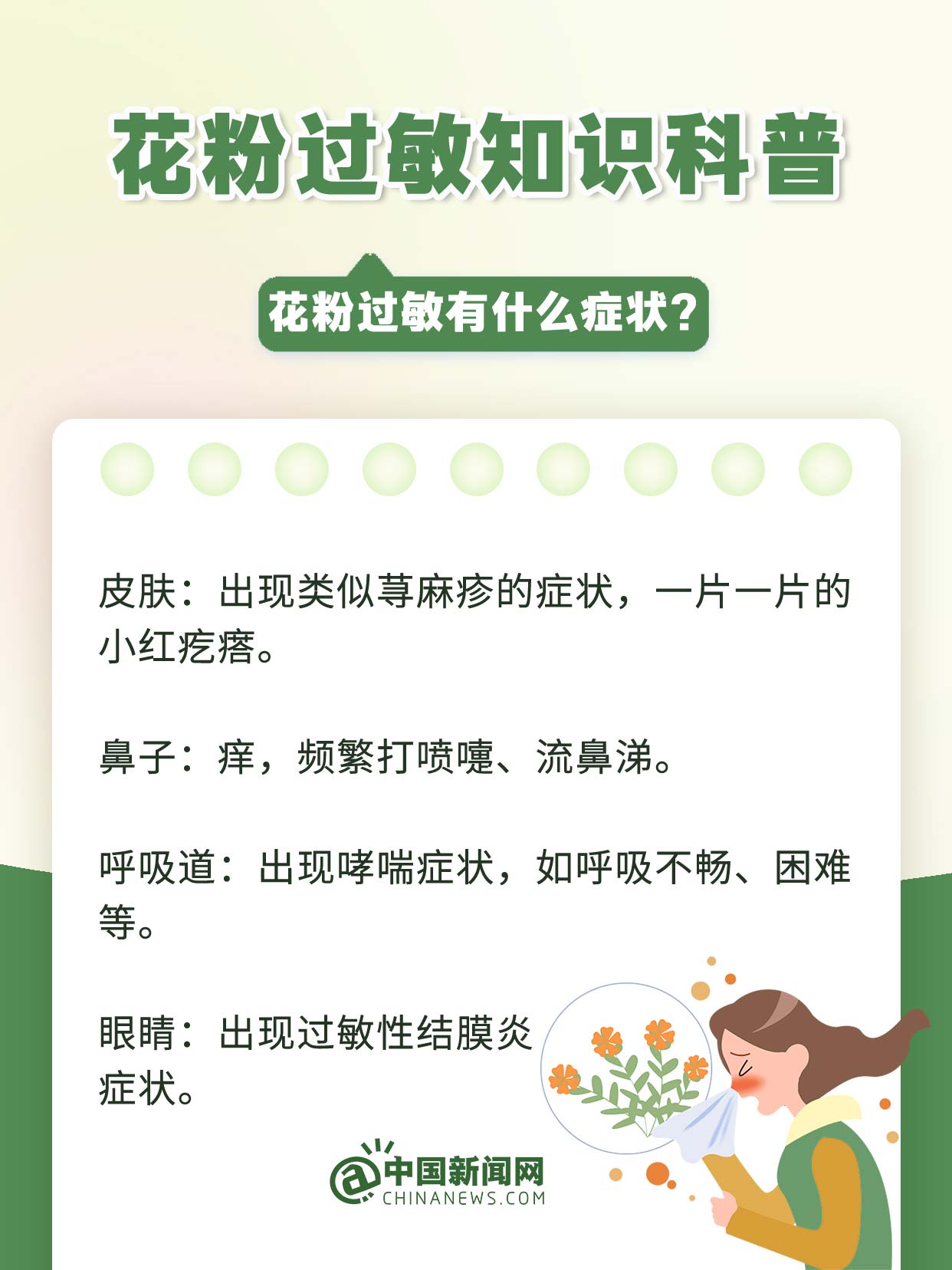 中新網(wǎng)3月19日電 萬物復蘇、草長鶯飛的春天,花粉過敏群體卻可能天天“一把鼻涕一把淚”?;ǚ圻^敏不是小事,若不及時治療或拖延不治,很容易惡化為慢性哮喘、鼻咽炎、結膜炎、肺炎等呼吸系統(tǒng)疾病。易過敏人群該如何防范?發(fā)生過敏如何治療?戳↓