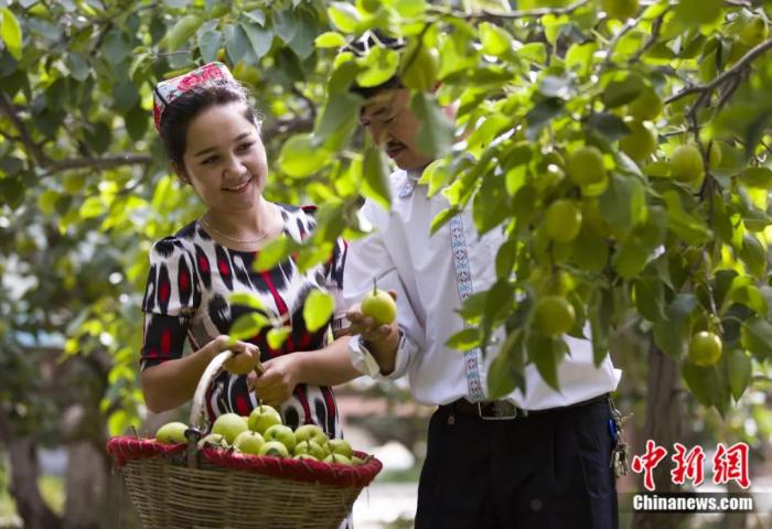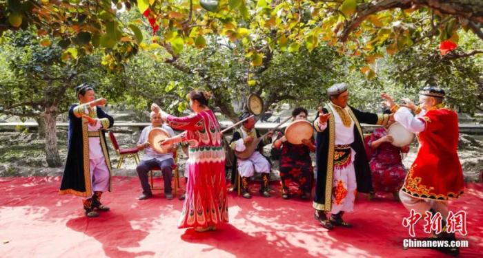 香梨成熟的季節(jié),當(dāng)?shù)卮迕裣灿憷娉墒?,歡快起舞。姚謙 攝