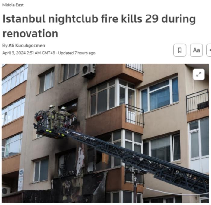 中新網(wǎng)4月3日電 據(jù)路透社報道,當?shù)貢r間2日,土耳其伊斯坦布爾一家位于多層建筑內的夜總會發(fā)生火災,造成至少29人遇難。