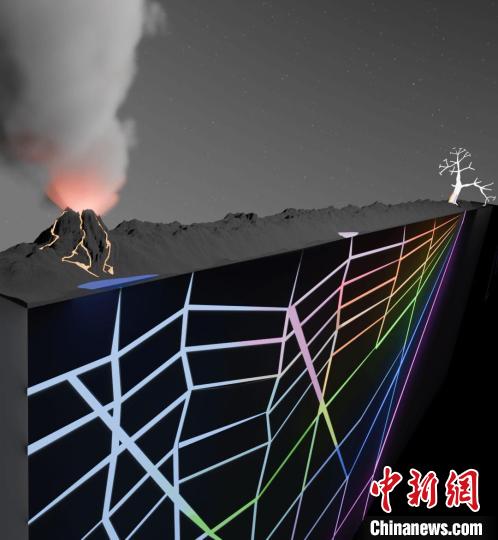 本次研究示意圖:由相互連接的巖石裂縫組成的地下網絡,在熱流的推動下積累并富集了生命起源前的化合物,從而促進了生命出現(xiàn)的早期化學過程(圖片來自Christof B. Mast)。施普林格·自然/供圖