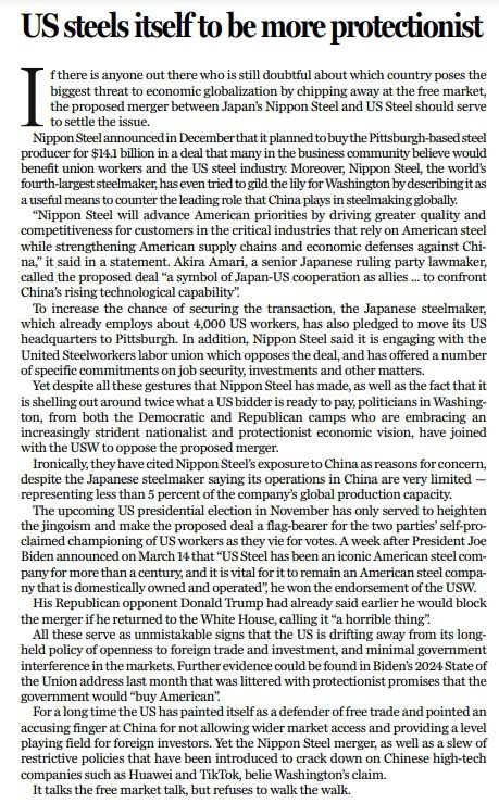 諷刺的是,美國政客們更以新日鐵在中國的業(yè)務(wù)為由,對這項收購提出了所謂的“關(guān)切”——盡管新日鐵宣稱,其在華業(yè)務(wù)范圍有限,且產(chǎn)能只占其公司全球產(chǎn)能的不到5%。