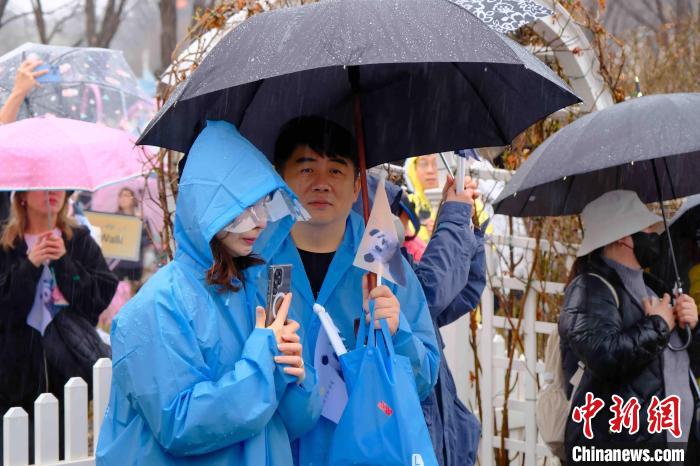 4月3日,民眾冒雨送行旅韓大熊貓“福寶”?!≈行律缬浾?劉旭 攝