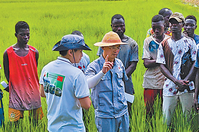 中國農(nóng)業(yè)專家為科特迪瓦農(nóng)民進(jìn)行水稻病蟲防治的培訓(xùn)。