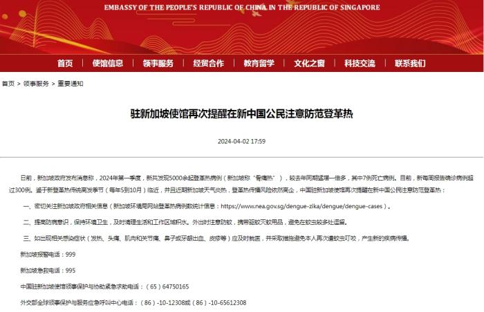 目前,新每周報告確診病例超300例,鑒于新登革熱傳統(tǒng)高發(fā)季節(jié)(每年5到10月)臨近,并且近期新加坡天氣炎熱,登革熱傳播風險高企,駐新加坡使館提醒在新中國公民注意防范登革熱: