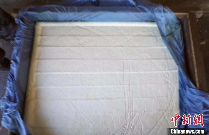 豆?jié){與石膏相遇,化學(xué)反應(yīng)后,豆香味縈繞在鼻尖,香氣彌漫在空氣中。這時,王志勇蓋上空隙均勻的木頭壓板,壓上石墩子,讓豆腐腦中的水分通過籠布和蓋板上的洞流走,等待豆腐壓好成型。