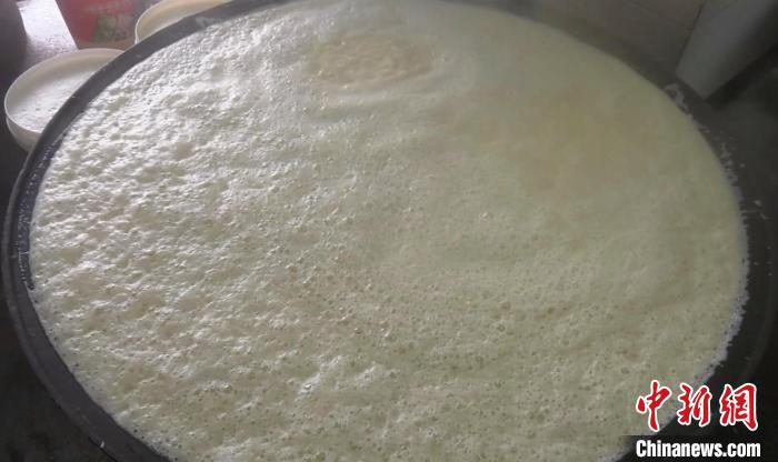 煮豆?jié){時,一口可以裝滿200公斤豆?jié){的鐵鍋,被一點(diǎn)點(diǎn)地裝滿,綿密的泡沫溢滿了整個鐵鍋,爐灶中的柴火通過燃燒散發(fā)出獨(dú)有的清香。