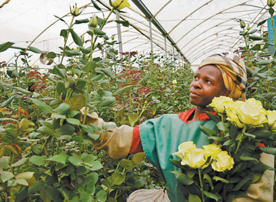 近年來,鮮花是肯尼亞出口中國的主要農(nóng)產(chǎn)品之一。圖為在肯尼亞奈瓦沙湖畔的一家鮮花農(nóng)場,一名花農(nóng)正在采摘鮮花。