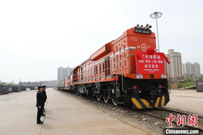 圖為“信陽—武漢—上海—泰國”鐵水海聯(lián)運列車在信陽站首發(fā)?!∫τ钕?攝