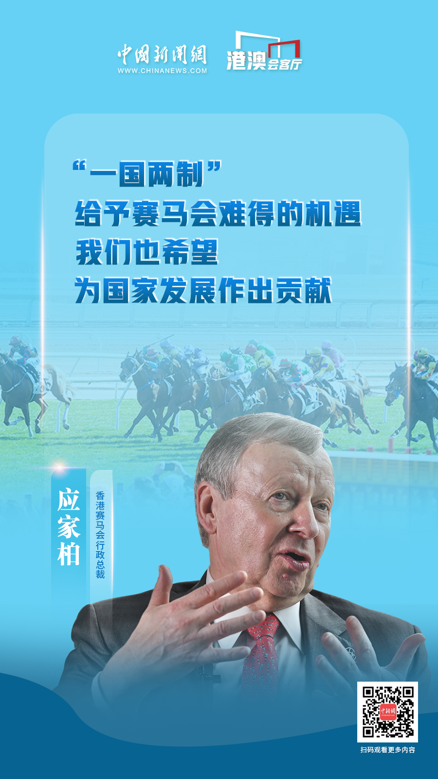 這是應(yīng)家柏出任香港賽馬會(huì)行政總裁的第17年,亦是《粵港澳大灣區(qū)發(fā)展規(guī)劃綱要》發(fā)布五周年,他帶領(lǐng)賽馬會(huì)緊握機(jī)遇,從“一國兩制”優(yōu)勢(shì),到粵港澳大灣區(qū)帶來的發(fā)展空間,繼續(xù)全方位地豐富著香港的賽馬精神。他如何看待香港賽馬事業(yè)發(fā)展現(xiàn)狀和瓶頸?未來拓展的方向又在何處?應(yīng)家柏近日接受中國新聞網(wǎng)“港澳會(huì)客廳”專訪,對(duì)這些問題一一作出解答。