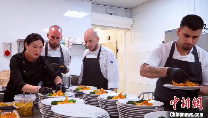2024年2月22日,夏蓉(左)與巴塞羅那洲際酒店的廚師團(tuán)隊(duì)合作為宴會(huì)制作中餐。受訪(fǎng)者供圖
