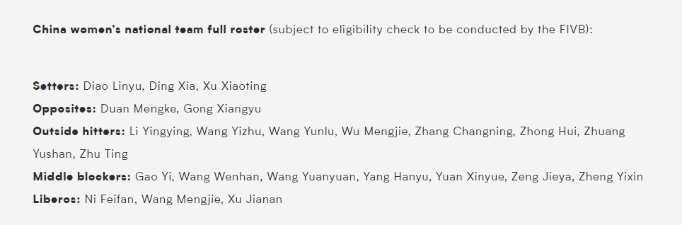 主攻:朱婷、李盈瑩、張常寧、王云蕗、王藝竹、吳夢潔、仲慧、莊宇珊