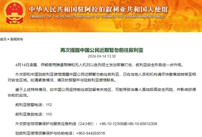 使館消息稱,4月14日凌晨,伊朗使用彈道導(dǎo)彈和無人機對以色列領(lǐng)土發(fā)動軍事打擊,敘利亞安全形勢進(jìn)一步升級。