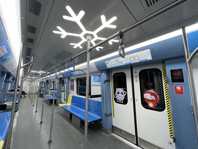 登上車廂,隨處可見(jiàn)冬奧元素。車頂?shù)臒魩Р辉賳握{(diào),而是被設(shè)計(jì)成了雪花的形狀,車廂扶手也融入了冰球桿的設(shè)計(jì)。而在車門上,北京冬奧會(huì)吉祥物“冰墩墩”和“雪容融”仿佛在和乘客們招手。