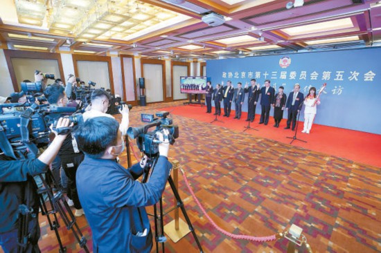 昨天,市政協(xié)十三屆五次會議舉辦“我是委員”集體采訪。8名委員在現(xiàn)場,1名委員通過視頻圍繞“冬奧有我”“科創(chuàng)中心建設(shè)”“履職為民”三個(gè)主題回答記者提問。 本報(bào)記者 方非攝