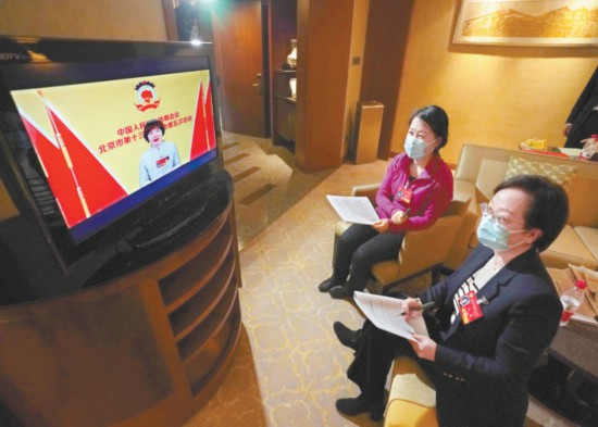 昨天晚上,市政協(xié)十三屆五次會(huì)議視頻播出大會(huì)發(fā)言,委員們?cè)隈v地各房間通過閉路電視、履職平臺(tái)APP收看。圖為民革界委員李鳳芹(右)和尤揚(yáng)(左)在房間收看委員發(fā)言。本報(bào)記者 方非攝
