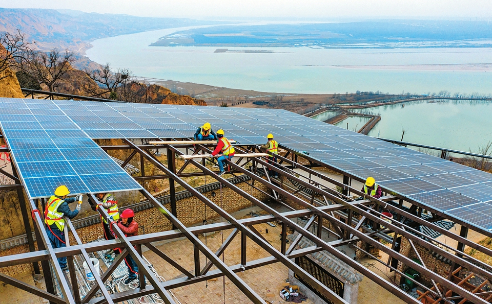 1月7日,施工人員在芮城縣陌南鎮(zhèn)莊上村安裝光伏板。近年來,該村因地制宜,大力發(fā)展綠色清潔新能源,目前全村72戶已用上“光儲直柔”村級發(fā)電系統(tǒng)。項目全部建成后,不僅可以滿足全村生產(chǎn)生活用電,每年還可向外配送170萬千瓦時清潔電力。(薛俊攝)