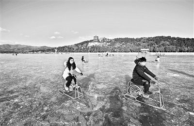 頤和園冰場的景色絕佳,冰場四周環(huán)繞著頤和園的亭臺樓閣,游客在冰面滑行的過程中,可切身感受到古人造園“步移景異”的精妙之處。冰上賞景的最佳選擇是騎行冰上自行車,冰上自行車幾乎對技術零要求,因為有金屬框架的支撐,騎行時比普通自行車還要平穩(wěn),冰上自行車可快可慢、可??烧?,游客呼吸著清冽的空氣,眼前則是高大雄偉的佛香閣與遼闊的西山群峰,盡管腳下在奮力地蹬車,在不知不覺間已融入到頤和園的山水畫卷之中。
