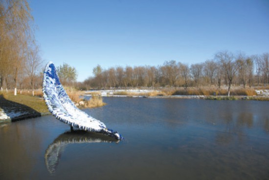在通州區(qū)城市綠心森林公園的水系中,也有一件為冬奧會(huì)新創(chuàng)作的公共藝術(shù)作品《舟》。它看起來如同一葉代表“同舟共濟(jì)”的輕舟,也像一根羽毛、一片象征著和平與友誼的橄欖葉。走近仔細(xì)看,雕塑由許多鵝卵石般的陶瓷顆粒組成。它由中國藝術(shù)研究院雕塑家張冕、郅敏合作,是北京冬奧會(huì)公共藝術(shù)作品征集活動(dòng)評(píng)選出的最佳作品之一。