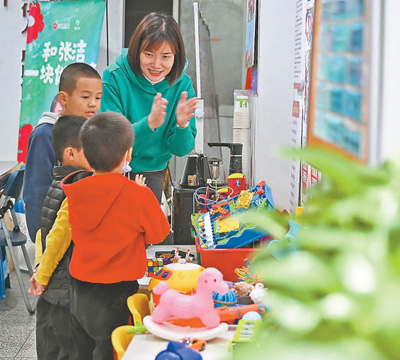 在福建省福州市晉安區(qū)鼓山鎮(zhèn)“村童媽媽聚樂部”志愿服務站,志愿者張潔在教小朋友唱歌。