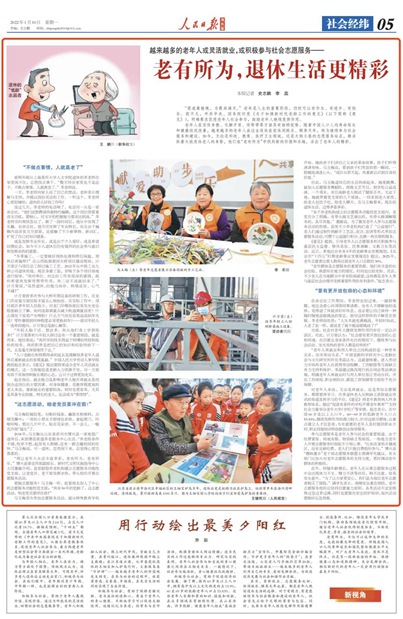 老年人在言傳身教、化解矛盾、傳幫帶等方面具有獨特優(yōu)勢。隨著中國人口人均壽命延長和健康狀況改善,越來越多的老年人由過去退休在家休閑娛樂、頤養(yǎng)天年,轉(zhuǎn)為繼續(xù)參與社會服務(wù)和建設(shè)。如今,無論是科技、教育、醫(yī)療衛(wèi)生領(lǐng)域,還是大街小巷的志愿服務(wù)站點,都活躍著大批退休老人的身影,他們在“老有所為”中找到新的價值和樂趣,活出了老年人的精彩。