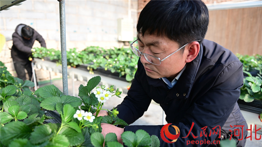 曲陽縣晾甲山現(xiàn)代農(nóng)業(yè)園區(qū)草莓大棚內(nèi),園區(qū)負責人段少輝正在查看草莓蜜蜂授粉及授粉后坐果情況。 李秀哲攝