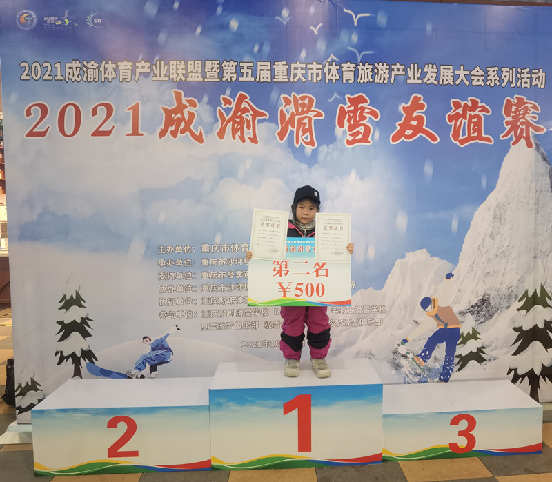 2021年夏天,萱萱迎來了第一場比賽——成渝滑雪友誼賽女子少年(U12)組比賽。當時4歲的萱萱是全場最小的參賽者,其他和她同臺角逐的都是8到12歲的小朋友。在平行回轉(zhuǎn)和坡面障礙兩個項目中,萱萱捧回了兩個第二名。