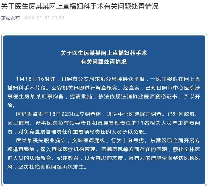 人民網(wǎng)日照1月21日電(聶俊穹)1月21日,山東省日照市東港區(qū)委宣傳部發(fā)布通報(bào)稱:1月18日16時(shí)許,日照市公安局東港分局接群眾舉報(bào),一醫(yī)生疑似在網(wǎng)上直播婦科手術(shù)片段。日照市公安機(jī)關(guān)迅即進(jìn)行調(diào)查核實(shí)。經(jīng)查實(shí),已對日照市中心醫(yī)院涉事醫(yī)生厲某某刑事拘留,提請批捕,依法依規(guī)注銷執(zhí)業(yè)醫(yī)師資格證書、予以開除。