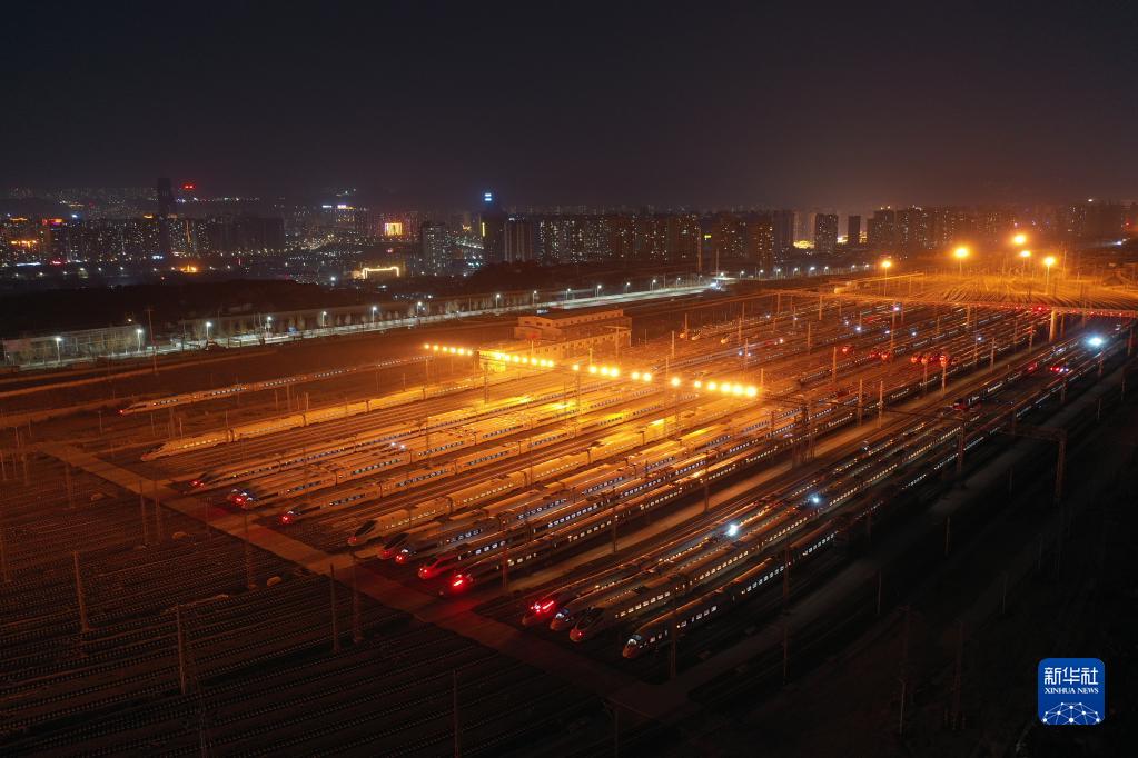1月16日晚,動車組列車??吭谥袊F路蘭州局集團(tuán)有限公司蘭州車輛段蘭州西動車運(yùn)用所整備場上,為1月17日開始的2022年春運(yùn)做好準(zhǔn)備(無人機(jī)照片)。新華社記者 杜哲宇 攝