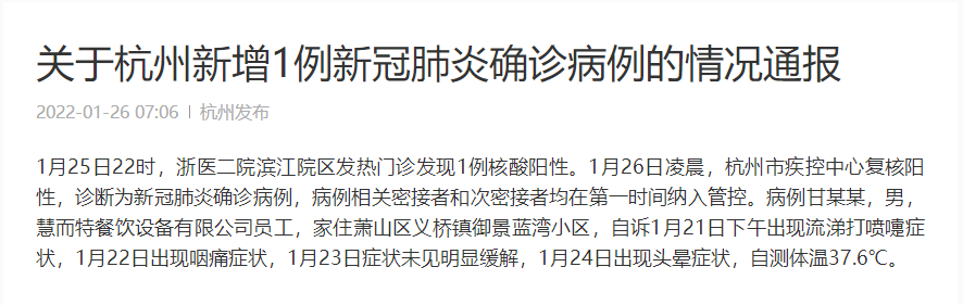 1月25日22時,浙醫(yī)二院濱江院區(qū)發(fā)熱門診發(fā)現(xiàn)1例核酸陽性。1月26日凌晨,杭州市疾控中心復(fù)核陽性,診斷為新冠肺炎確診病例,病例相關(guān)密接者和次密接者均在第一時間納入管控。病例甘某某,男,慧而特餐飲設(shè)備有限公司員工,家住蕭山區(qū)義橋鎮(zhèn)御景藍(lán)灣小區(qū),自訴1月21日下午出現(xiàn)流涕打噴嚏癥狀,1月22日出現(xiàn)咽痛癥狀,1月23日癥狀未見明顯緩解,1月24日出現(xiàn)頭暈癥狀,自測體溫37.6℃。
