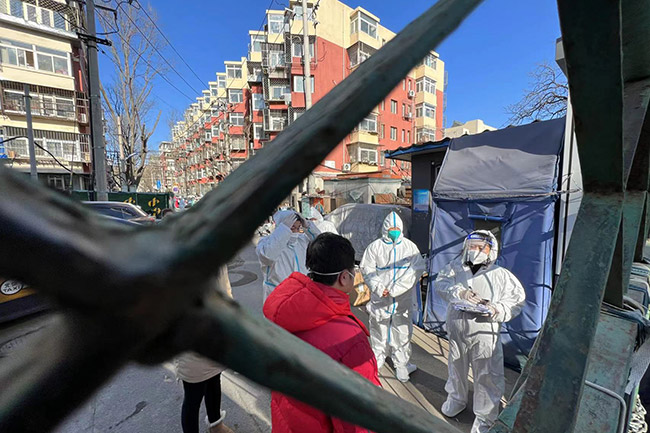 1月25日早8點(diǎn),室外氣溫低于零度,而今日的大風(fēng)天氣更降低了體感溫度。在小區(qū)門口,街道和社區(qū)的“大白”們早已就位,在管控區(qū)外值守并隨時(shí)準(zhǔn)備為身體不便的居民進(jìn)行入戶核酸檢測工作。