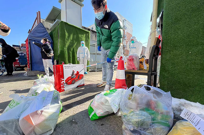 為保障居民買菜用餐等正常生活,院內(nèi)居民可以通過外賣快遞采購物資,也可以通過社區(qū)代為采購。封控區(qū)居民通過快遞外賣的購買物品,會(huì)在消殺后,由工作人員送至門口。對不會(huì)使用網(wǎng)絡(luò)購物的居民,社區(qū)提供了配餐和送貨上門服務(wù)。