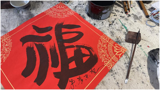 現(xiàn)場(chǎng),朱者赤還即興提筆,墨躍紅紙,以倒序筆畫寫下福字,以此寄予“福到了”的新年祝福。作為入駐林家藝術(shù)村的第一批自由職業(yè)藝術(shù)家,朱者赤認(rèn)為,鄉(xiāng)村的自然恬淡能為藝術(shù)家的創(chuàng)作帶來許多靈感,而藝術(shù)賦能也會(huì)對(duì)美麗鄉(xiāng)村建設(shè)會(huì)起到推進(jìn)作用,他希望自己能在其中發(fā)揮作用,在不斷創(chuàng)作創(chuàng)新的同時(shí),讓更多藝術(shù)美走進(jìn)鄉(xiāng)村中去。