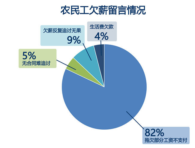 在群眾留言中,農(nóng)民工欠薪的情況大部分為薪資未全額支付,這類(lèi)占留言總數(shù)的約82%;無(wú)勞動(dòng)合同、反復(fù)追討無(wú)果以及拖欠生活費(fèi)的情況也有發(fā)生。項(xiàng)目工程結(jié)算困難、用工方推諉則是導(dǎo)致欠薪的主要原因。