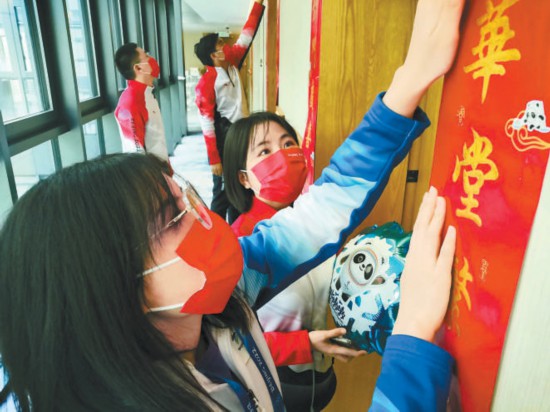 服務(wù)保障人員的村內(nèi)生活也趣味十足。下午3點多,一場“守海陀歲·延慶冬奧村新村民共贏未來”主題活動在訪客中心舉行?!拔⑿Φ难?,為大地開花;愛灑向手心,純潔無瑕……”中外志愿者們用12種語言唱起北京冬奧會志愿者之歌《燃燒的雪花》,擊鼓傳花,匿名交換明信片,現(xiàn)場溫馨又熱鬧。而在媒體中心,志愿者寫福字,貼福字,迎接春節(jié)和冬奧的到來。晚上6點多,延慶冬奧村還迎來了“志愿者虎年春節(jié)聯(lián)歡晚會”,志愿者各顯身手帶來彈唱、傳統(tǒng)曲藝、芭蕾舞表演等節(jié)目,以“線上村晚”開啟新的一年。