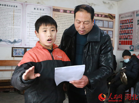 涉縣賽戲代表性傳承人教小徒弟表演賽戲。 李獻海攝