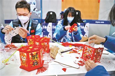 昨天是中國的傳統(tǒng)節(jié)日元宵佳節(jié),國家體育館開展了豐富多彩的慶?;顒樱斕靾鲳^餐廳提供了湯圓,場館禮賓部工作人員向外賓介紹中國吃湯圓的由來和寓意,并邀請大家品嘗。在志愿者之家內(nèi),彩燈高懸,充滿歡聲笑語,志愿者們做燈籠、猜燈謎,共同度過一個歡樂祥和的元宵節(jié)。圖為冬奧志愿者在制作花燈。文并攝/本報記者 黑建軍