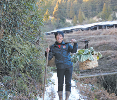 葉美英踏著積雪挑著扁擔走在送菜的路上。祁鵬飛攝(人民視覺)