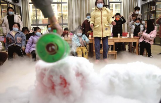 日前,嘉興市秀洲區(qū)高照街道秀清社區(qū)請(qǐng)來科技館老師,將兒童科學(xué)實(shí)驗(yàn)課堂搬到社區(qū),讓孩子們?cè)诩议T口就能上有趣又好玩的科學(xué)實(shí)驗(yàn)課。(馮玉坤)