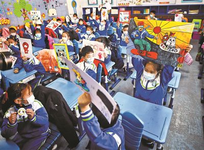 昨天是本市中小學(xué)生春季學(xué)期開學(xué)首日,各校的開學(xué)第一課紛紛以傳播“冬奧精神”為主打,將冬奧融入“大思政課”。圖為昨天,中科院附屬玉泉小學(xué),同學(xué)們展示自己在寒假里創(chuàng)作的以冬奧、“冰墩墩”為主題的藝術(shù)作品。攝影/本報記者 郝羿