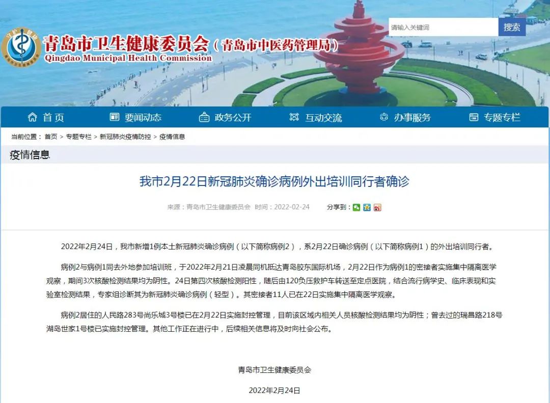 人民網(wǎng)青島2月24日電(鄭浦麗)據(jù)青島市衛(wèi)生健康委員會(huì)消息,2022年2月24日,青島市新增1例本土新冠肺炎確診病例(以下簡(jiǎn)稱(chēng)病例2),系2月22日確診病例(以下簡(jiǎn)稱(chēng)病例1)的外出培訓(xùn)同行者。