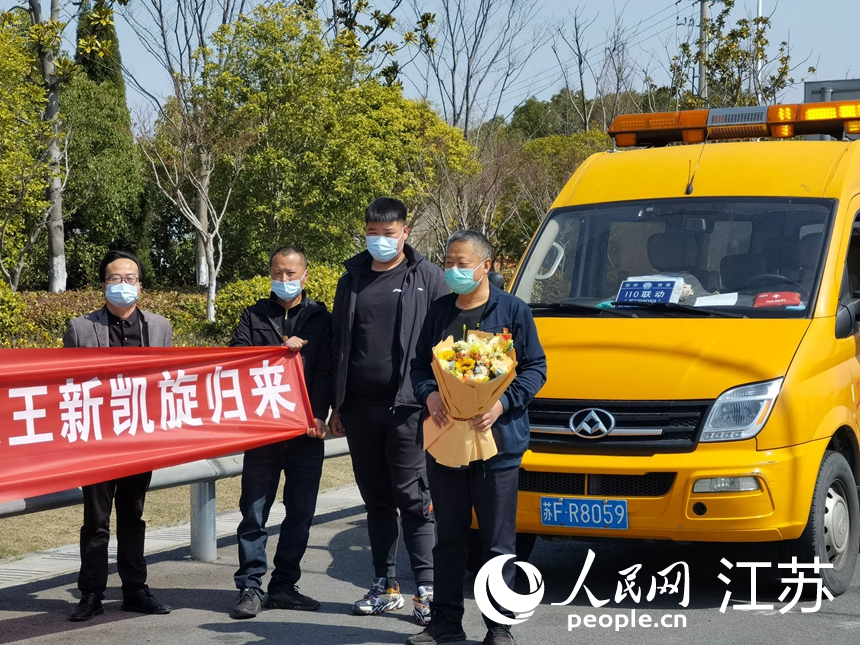 王新所在村村干部及志愿者歡迎王新蘇州戰(zhàn)疫歸來。人民網(wǎng)記者 王繼亮攝