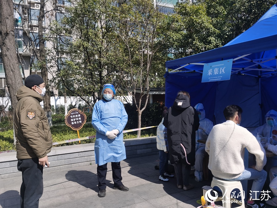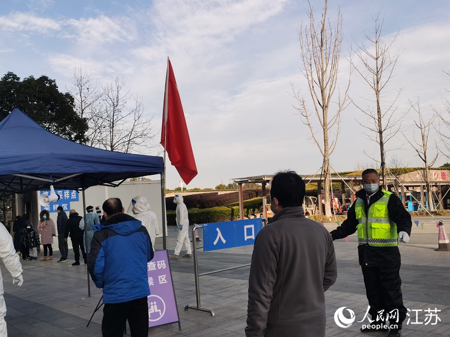 2月24日上午,在姑蘇區(qū)三香公園內(nèi),王新(中)在核酸檢測采樣點維持秩序。人民網(wǎng)記者 王繼亮攝